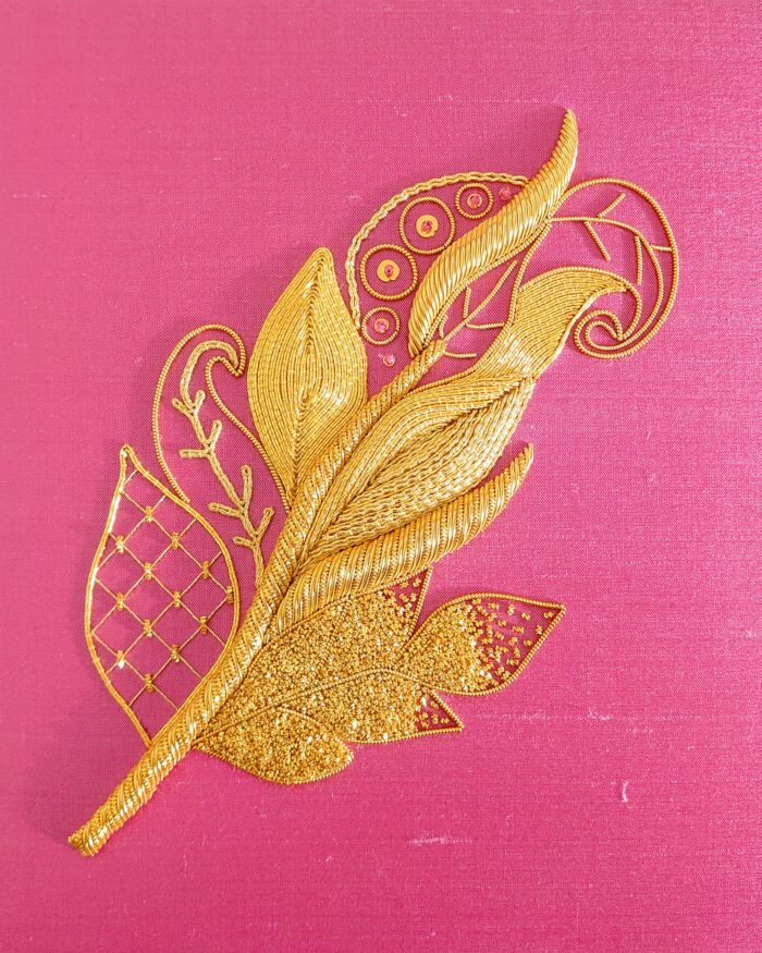 ゴールドワークというと、背景は紺や紫など高級感のあるものが多いですが、今回はピンクにしてみました。この組み合わせもとても気に入ってます。