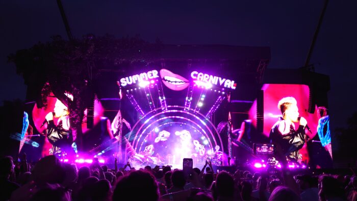 最後のオープニングアクトが終わると、レジャーシートをひいていた人たちも片付けて、じわじわっと前に詰めていく動きになります。必ず詰める必要もないので、前に行きたい人は行く、ステイしたい人はステイ。この各自感がいいところだと思います。約1時間空くので、トイレも焦らなくて大丈夫です。