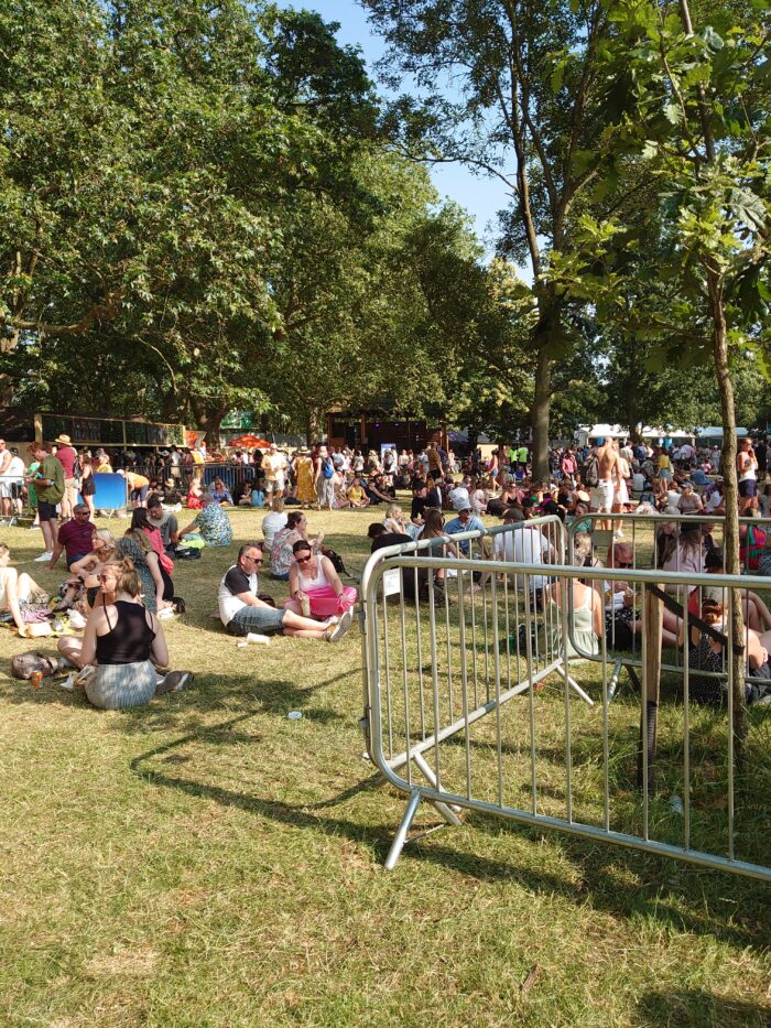 ハイドパークは、グラストンベリーとは比になりませんが、ロンドンでは最大規模の野外会場。後ろの方ならステージはほぼ見えないけれど、みんな短いイギリスの夏の日差しとお祭りの空気を、2時の開場から、メインアクトが始まる8時まで、のんびりそれぞれの楽しみ方で過ごします。